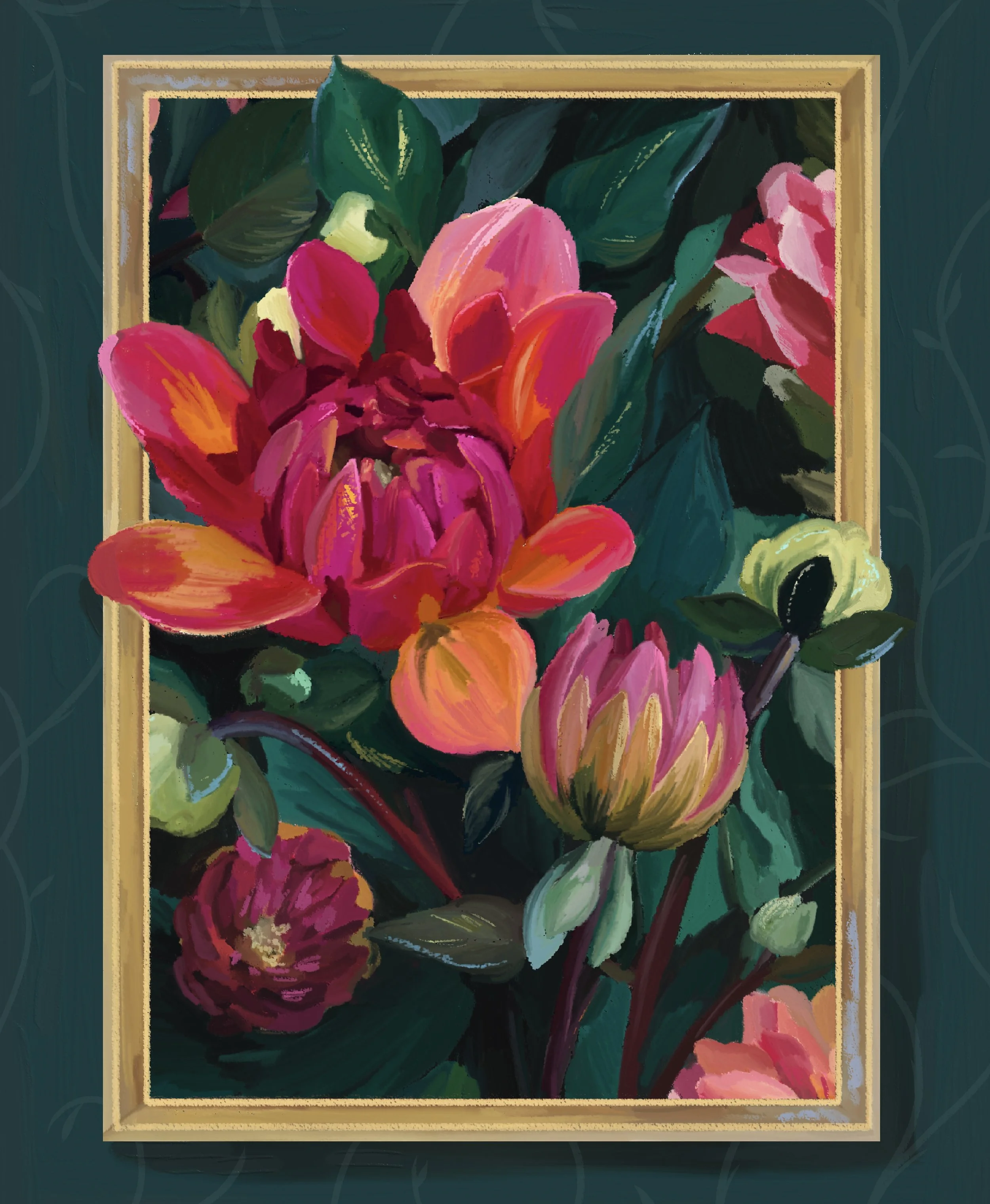 This jigsaw puzzle features a charming illustration of a framed painting of Dahlia Pinnatas. The vibrant blossoms whimsically extend beyond the frame, adding a playful, surreal touch. Mosaic Puzzles is a company dedicated to turning art into engaging experiences. They specialize in beautifully crafted jigsaw puzzles that highlight unique illustrations and artistic details.